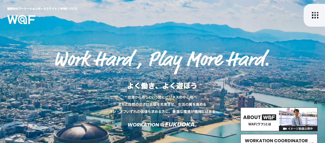 福岡市と福岡観光コンベンションビューローは、7月16日に、福岡型ワーケーションの専用ポータルサイトW@F (ワフ)をスタートしました。「Work Hard ,Play More Hard. ~よく働き、よく遊ぼう~」をコンセプトとして、福岡市内におけるワーケーションの魅力を紹介しています。