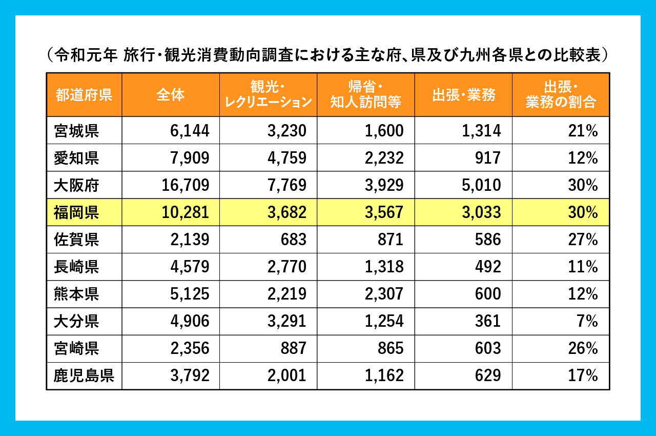 新型コロナウィルスの感染流行前は、他都市と比べて、ビジネスの利用客がとても多かったのです。県ベースの数値ではありますが、大阪と並んで約3割の宿泊客が出張等によるビジネス利用。ビジネスの中心地でありコンベンションの開催も盛んな福岡市内においてはさらにその比率が高いものと推察されます。