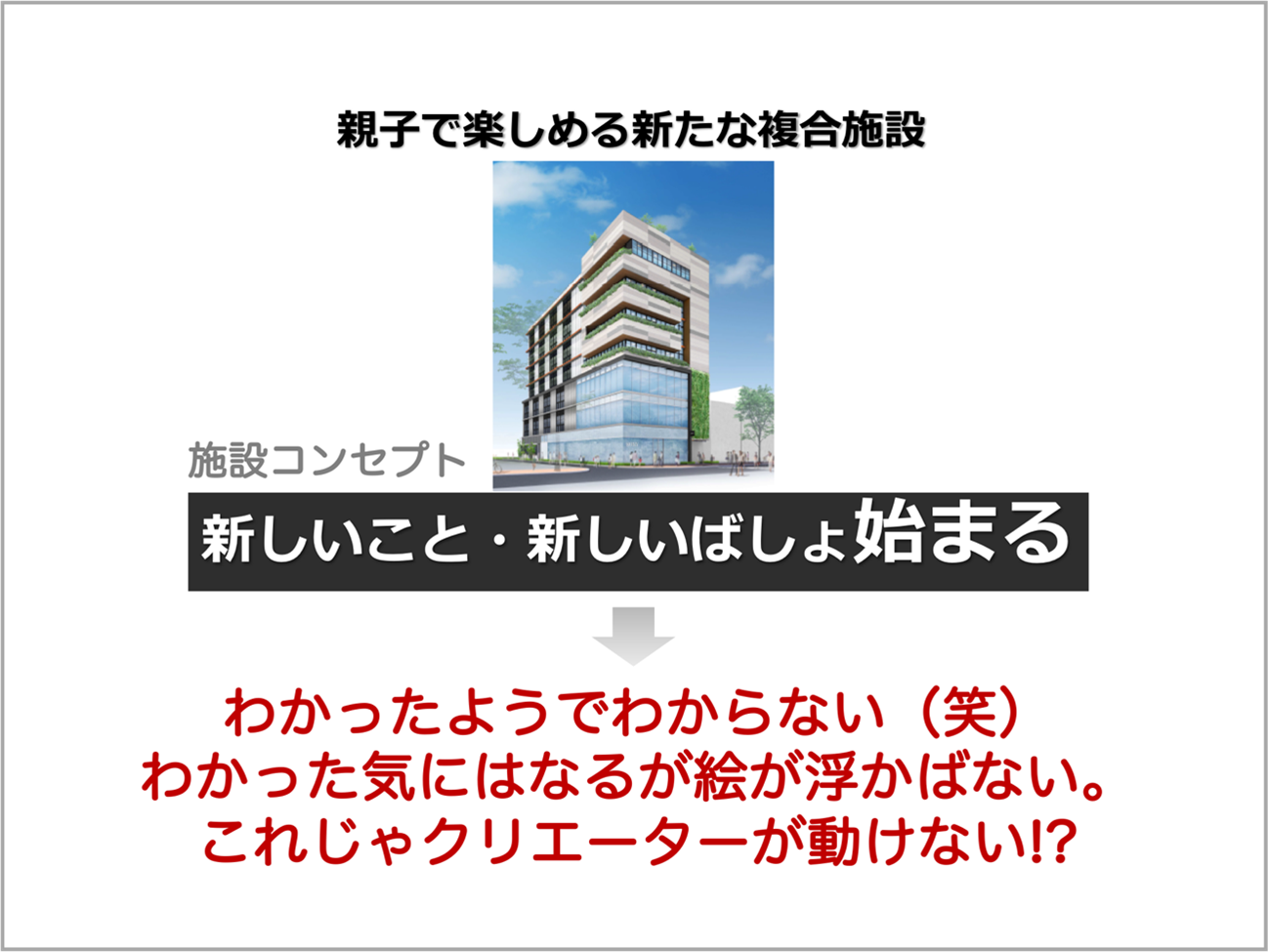 ディベロッパーは、建築家に施設の設計を依頼する。どのような施設にしたいのか!?どのようなテナントを誘致するのか!?その想いと経済合理によって、それらしい“施設コンセプト”は完成する。