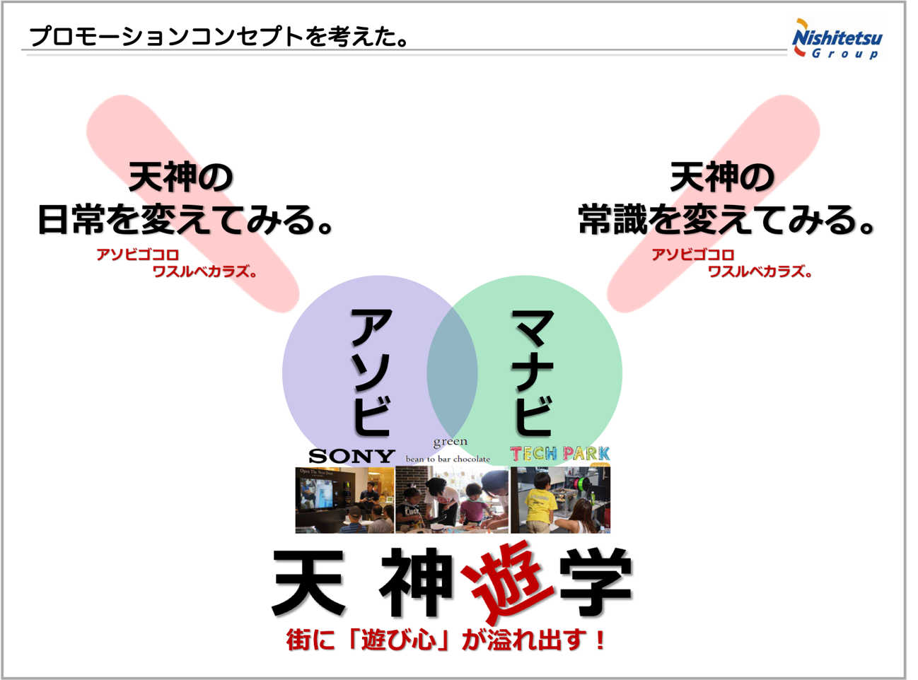 施設コンセプトが静的なものであるとしたら、ネーミングに必要なのは“動的”なコンセプトである。どんなプロモーションが起こると面白いのか!?どんなコミュニケーションが生まれると本望か!?そんなことを、改めて明文化していく過程で、ネーミングの方向性が見えてくる。キーワードが自ずと生まれてくる。