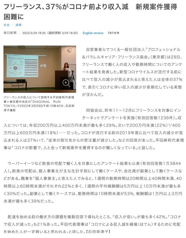 毎日新聞に掲載された『フリーランス、37%がコロナ前より収入減 新規案件獲得困難に』 https://mainichi.jp/articles/20220329/k00/00m/040/214000c のフリーランスへのアンケートを紹介した記事によると『新型コロナウイルスが流行する前に比べて収入の減少が見込まれると答えた人は全体の37%』とのことでした。
