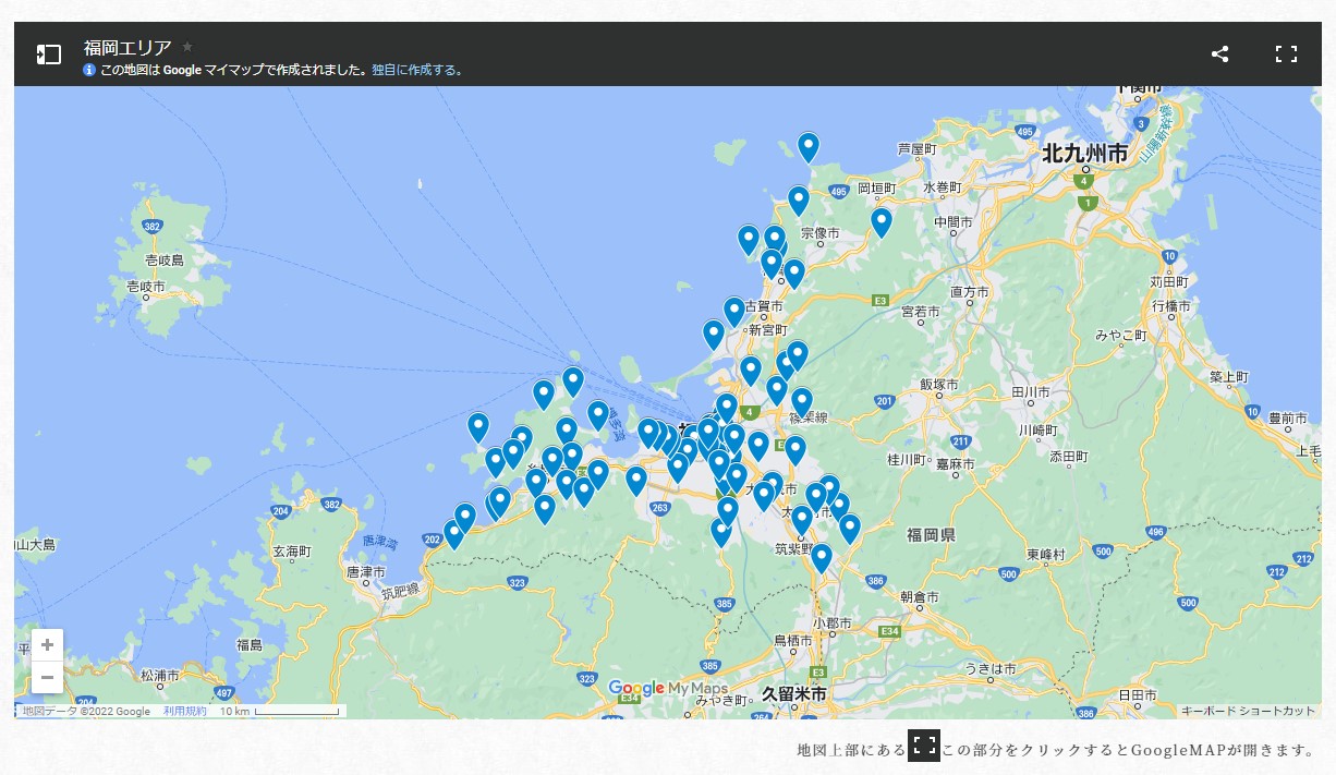 サイト内では、自分の住んでいるエリアをクリックすると、そのエリアで有人の神社一覧がGoogle MAPにピン打ちされて表示されます。