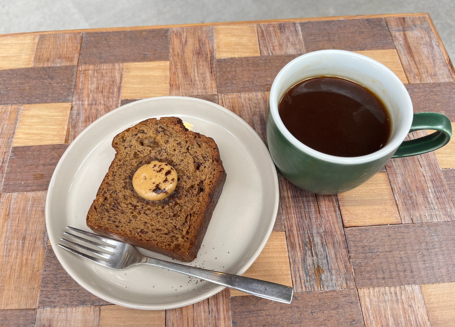 フードは自家製のスイーツや、12時までのモーニングも人気。この日はコーヒーと一緒にほろ苦いエスプレッソバターがアクセントの「バナナブレッド」(500円)をいただきました。
