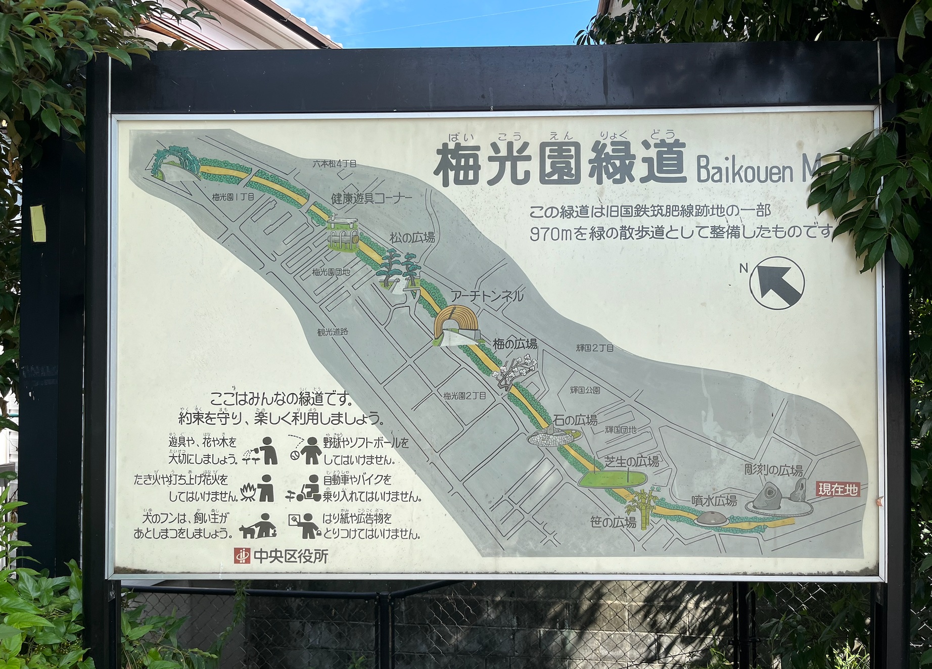 小笹のお隣・中央区笹丘と六本松を結ぶ、全長970mの「梅光園緑道」。ここはかつて博多駅から唐津駅まで走っていた旧国鉄筑肥線跡地の一部を、緑の散歩道として整備した緑道です。