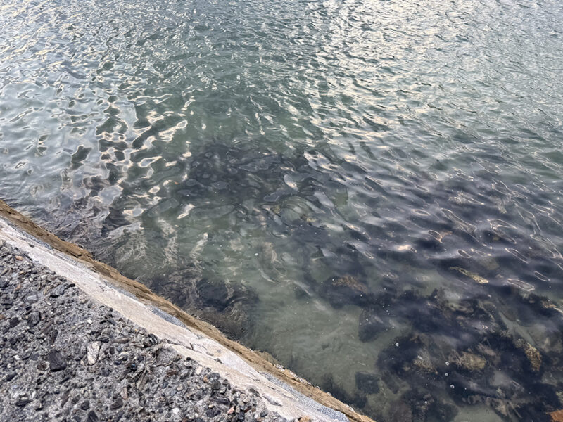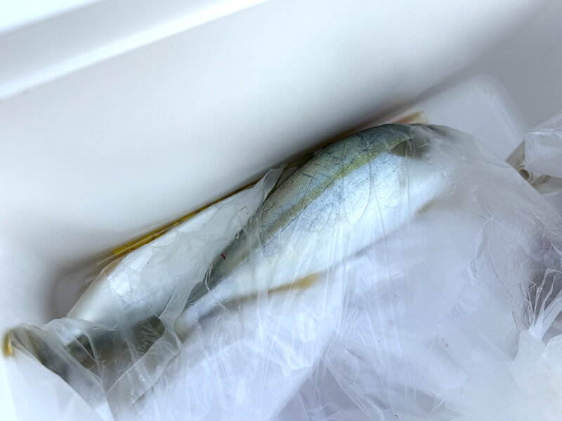 ルアーを投げていた釣り人に声をかけて、クーラーの中を見せてもらうと、釣り上げたばかりの数匹のヤズ(ブリの若魚)が数匹入っていました。