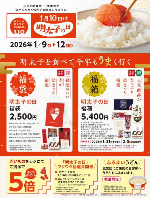 さらに県内にあるふくや直営店では、1月9日〜12日までイベントが開催されています。毎年好評の明太子の日福袋や福箱、数量限定のふるまいうどんに明太子の日ワクワク抽選会など、明太子を存分に楽しめる特典がいっぱい!お得においしく明太子を味わってください。