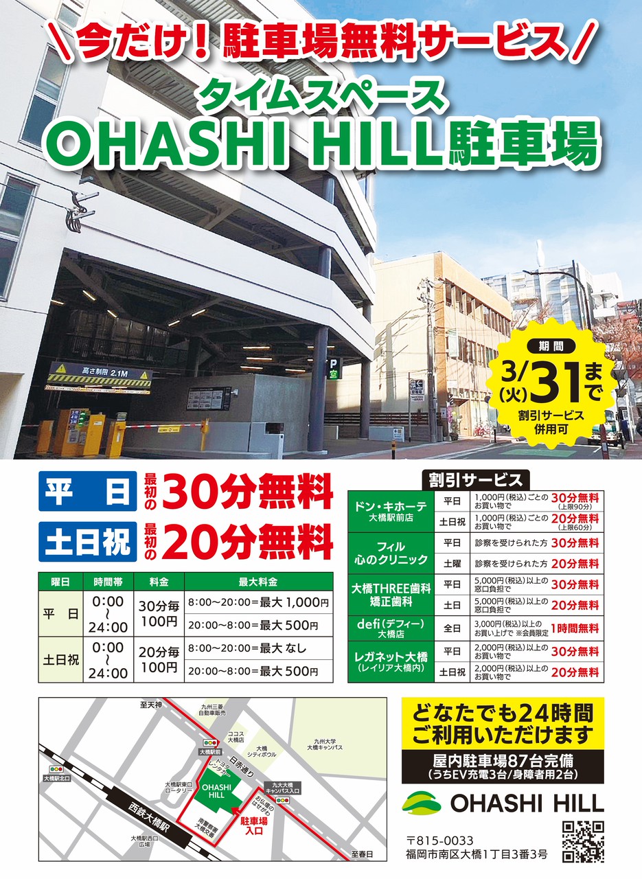 「OHASHI HILL」内のテナント、または大橋駅直結の「レイリア大橋」内「レガネット大橋」を利用すると、駐車場の割引が受けられるのも嬉しいポイント。都心部へのマイカー乗り入れを減らす「パーク・アンド・ライド」推進の一環として、当日に西鉄電車を利用した方は駐車料金が割引されるサービスもあります。しかも2026年3月末までは、さらにお得な駐車場無料サービスタイムも実施中!この機会にぜひ大橋探検をしてみてはいかがでしょうか。