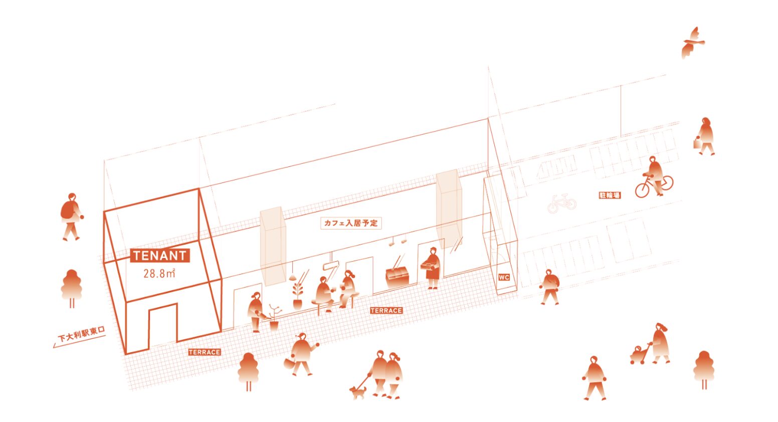 募集区画は、西鉄下大利駅の北側の高架下空間にできる建物のうち、北側駐輪場の1階に位置する28.8㎡の区画です。