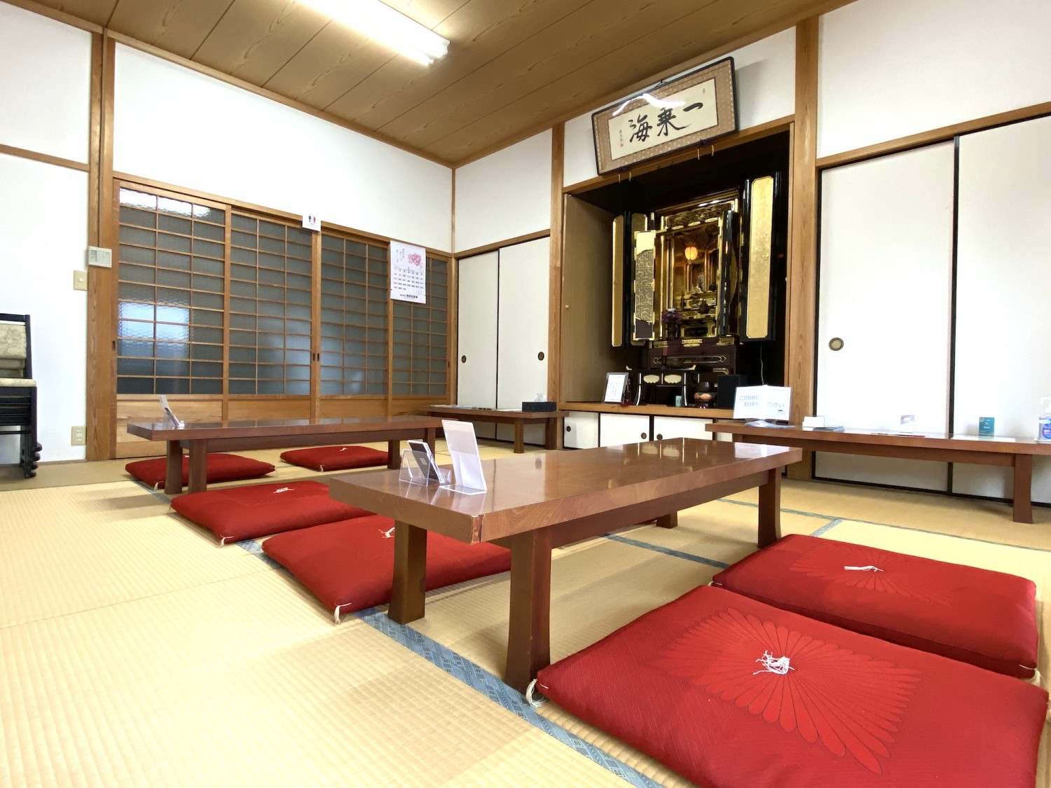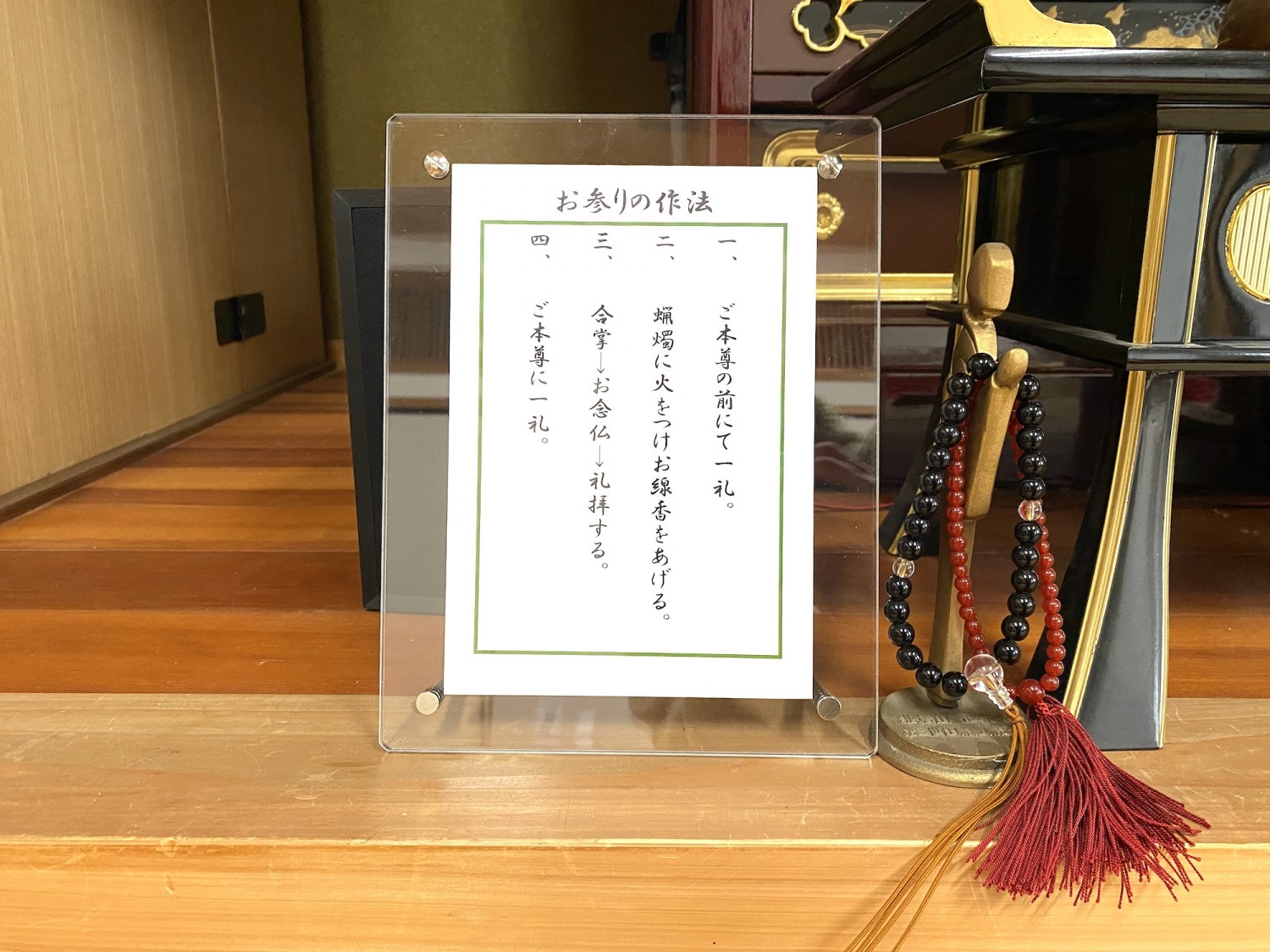 部屋の中心には仏壇が置かれていて、お参りの作法についての記載があります。なかなかお寺や仏教にふれる機会がない方たちにとっては、とても新鮮ですし、勉強にもなりますよ。