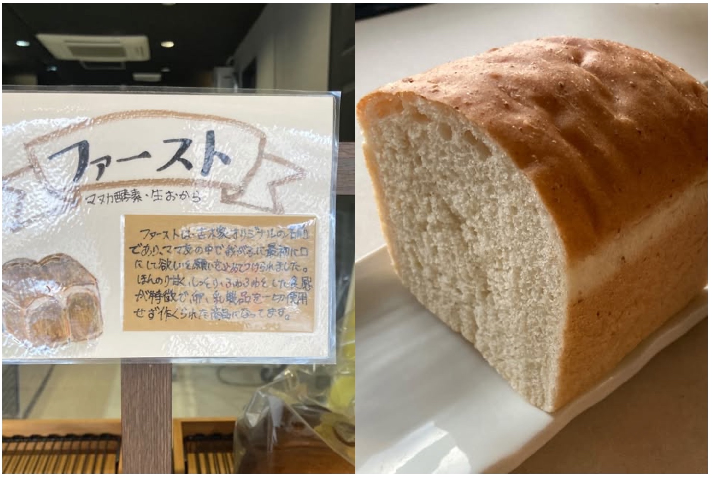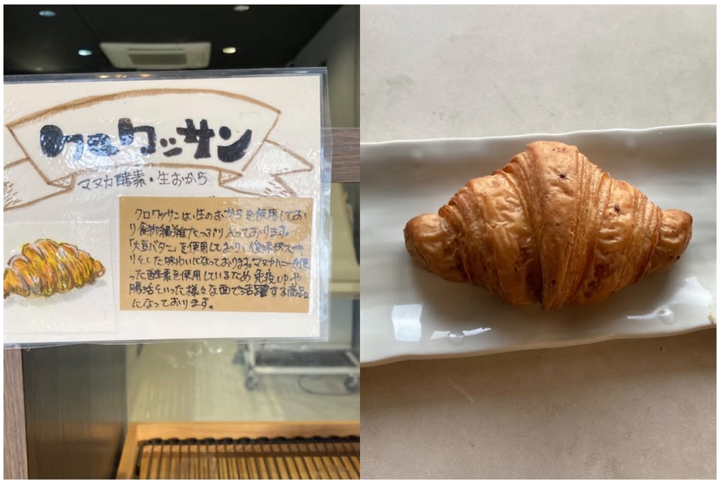 というわけで、筆者もいろいろ想像すべく、さっそく実食。マヌカハニー酵母と生おからの覚醒生地、と書かれた商品の中から、ファースト食パンと、クロワッサンを購入させて頂きました。どちらも福岡店限定です。