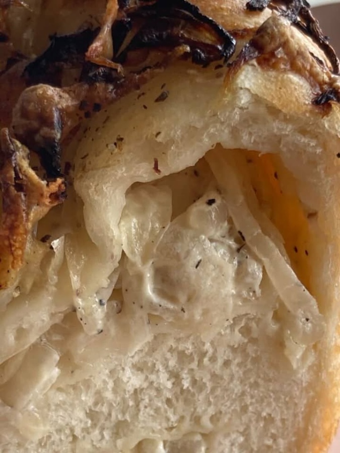 トップに玉ねぎ&チーズ。中にも、黒胡椒をしっかり纏ったスライス玉ねぎがたっぷり、チーズもin!!