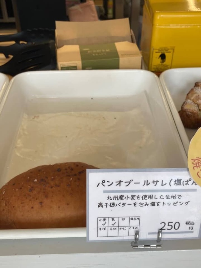 塩パンあります、の看板に引き寄せられるように入店すると、ちょうど太陽の光が優しく差し込む時間帯、柔らかい日光で、小さな売り場全体が、白く、眩く見えました。作業場も見渡せる「いろいろなことが安心安全の証仕様」。店員さんとの距離も近くて、、、まずそれに嬉しくなります。