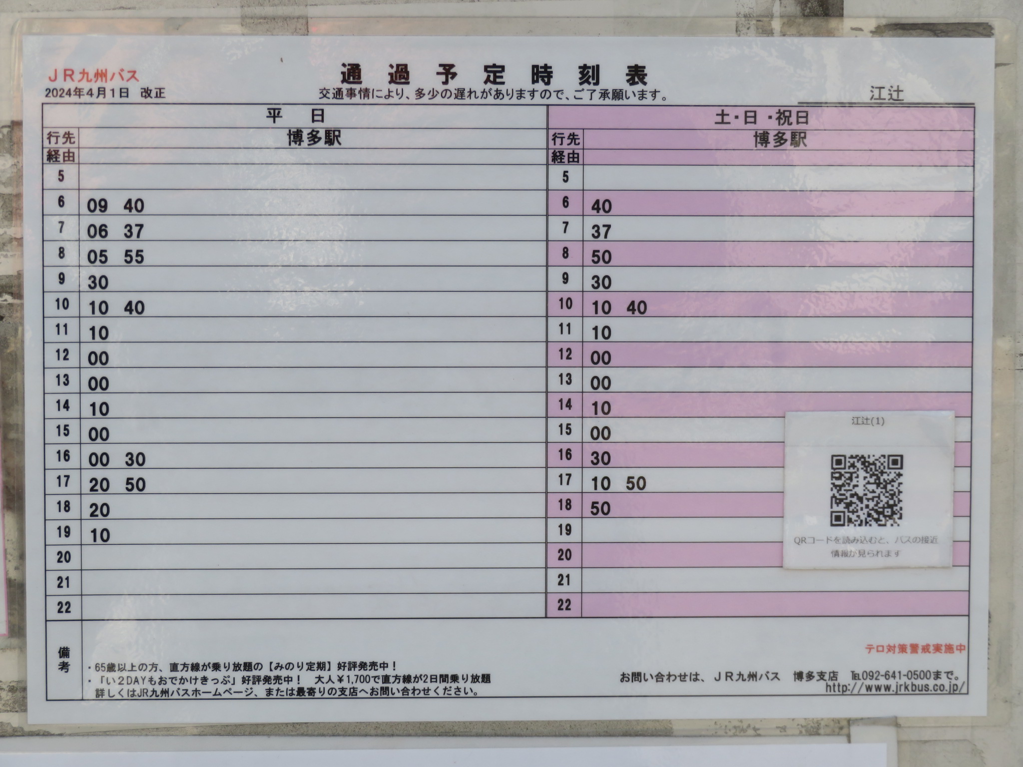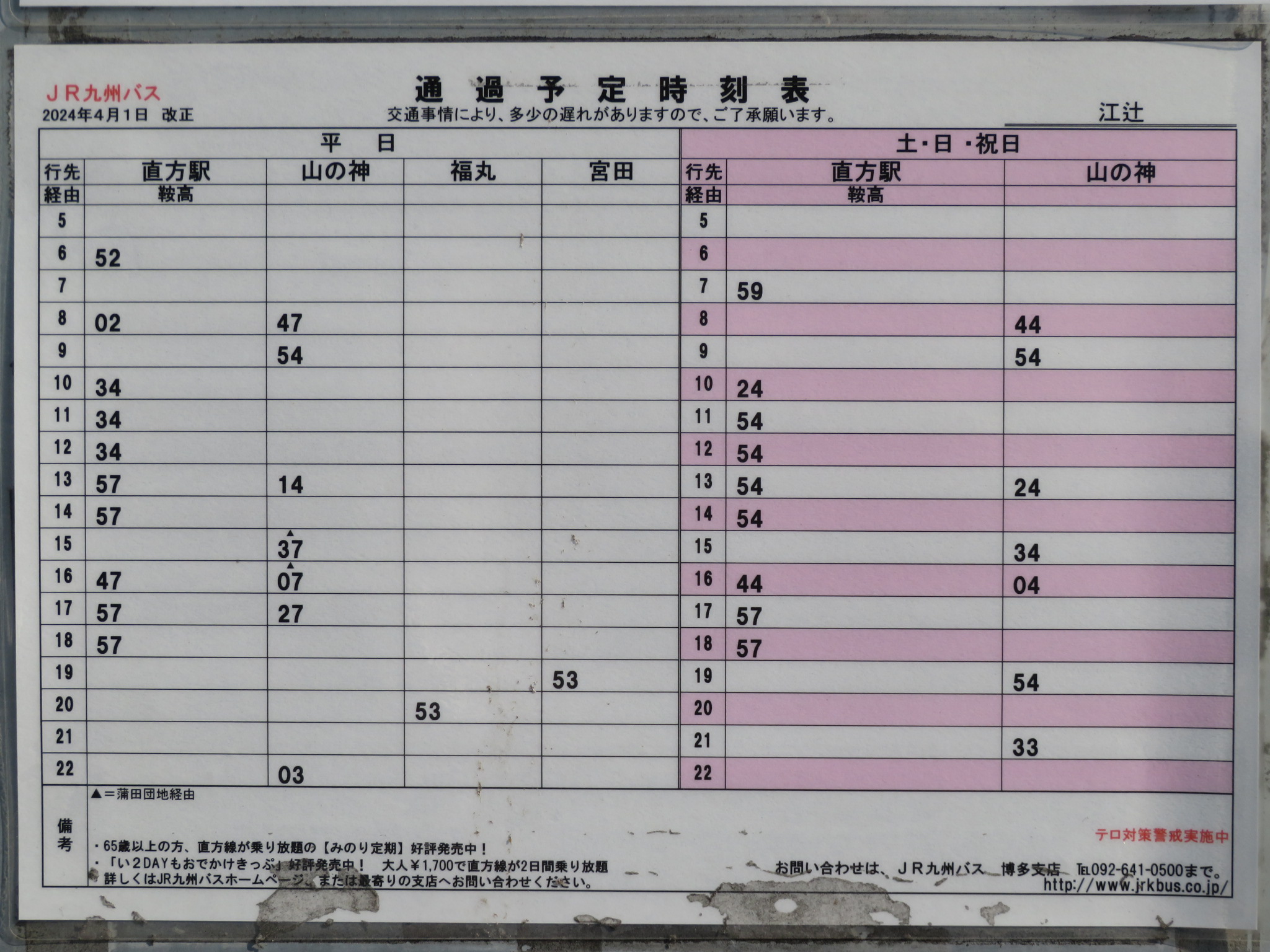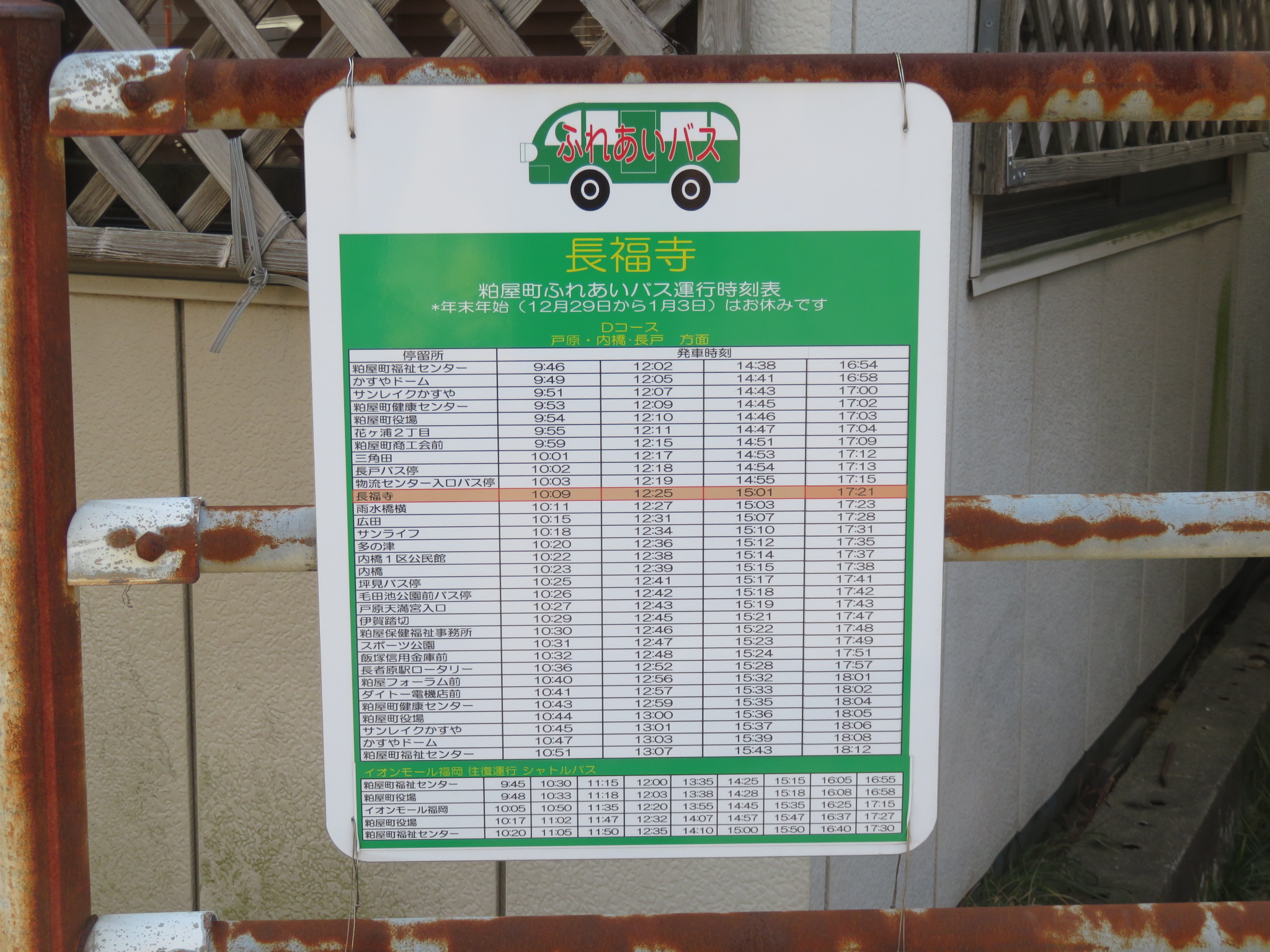 時刻表があります。粕屋町ふれあいバスのものです。令和7年での運行終了が予定されています。