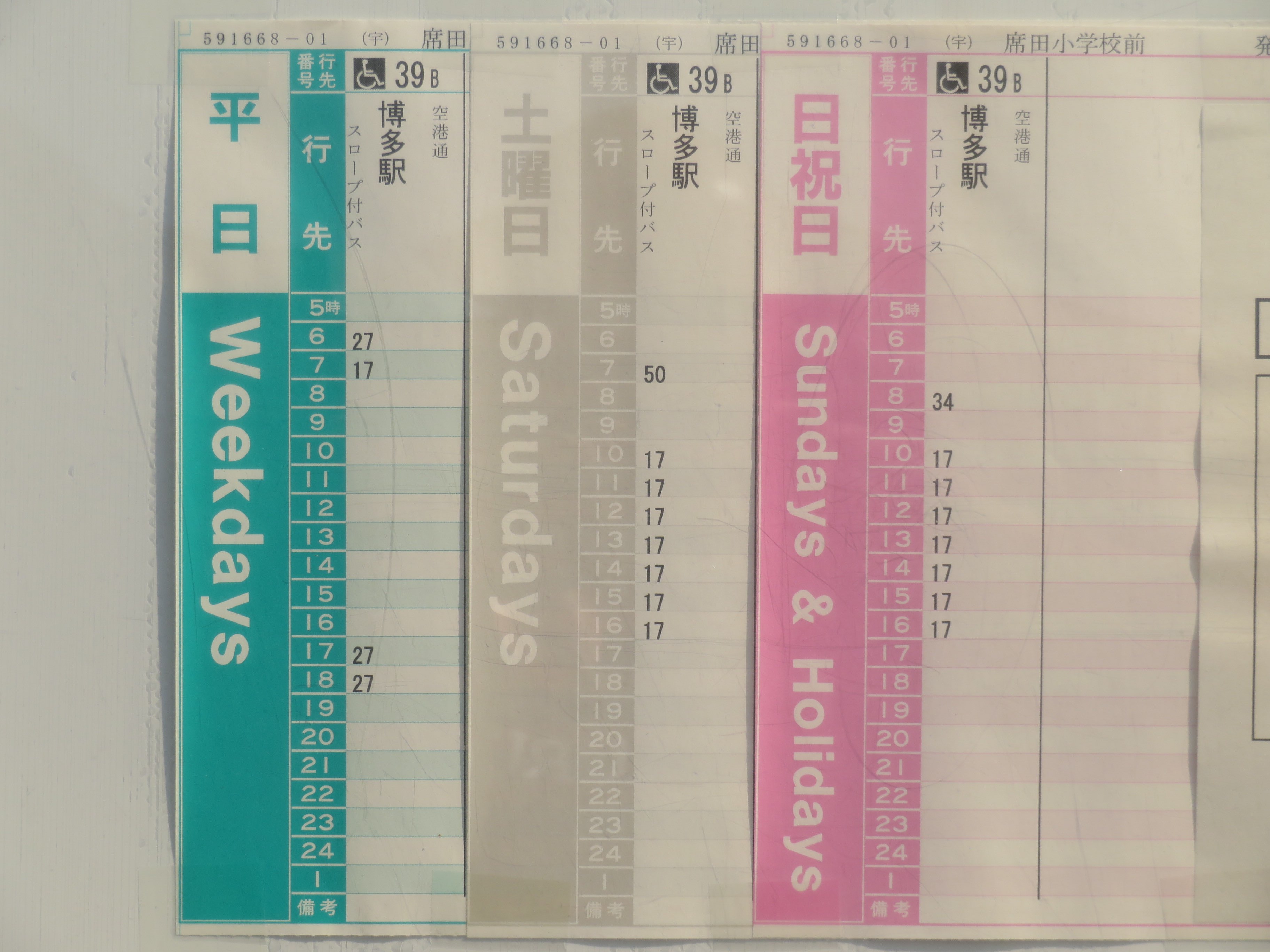 博多駅方面の時刻表は、いろいろと印象的です。土日祝日は日中に安定して1本ずつあるのに、なぜか平日は朝夕以外の空白時間が極端に長くなっています。平日の日中に利用者などいない、と一刀両断にできる事情があるのでしょうか?