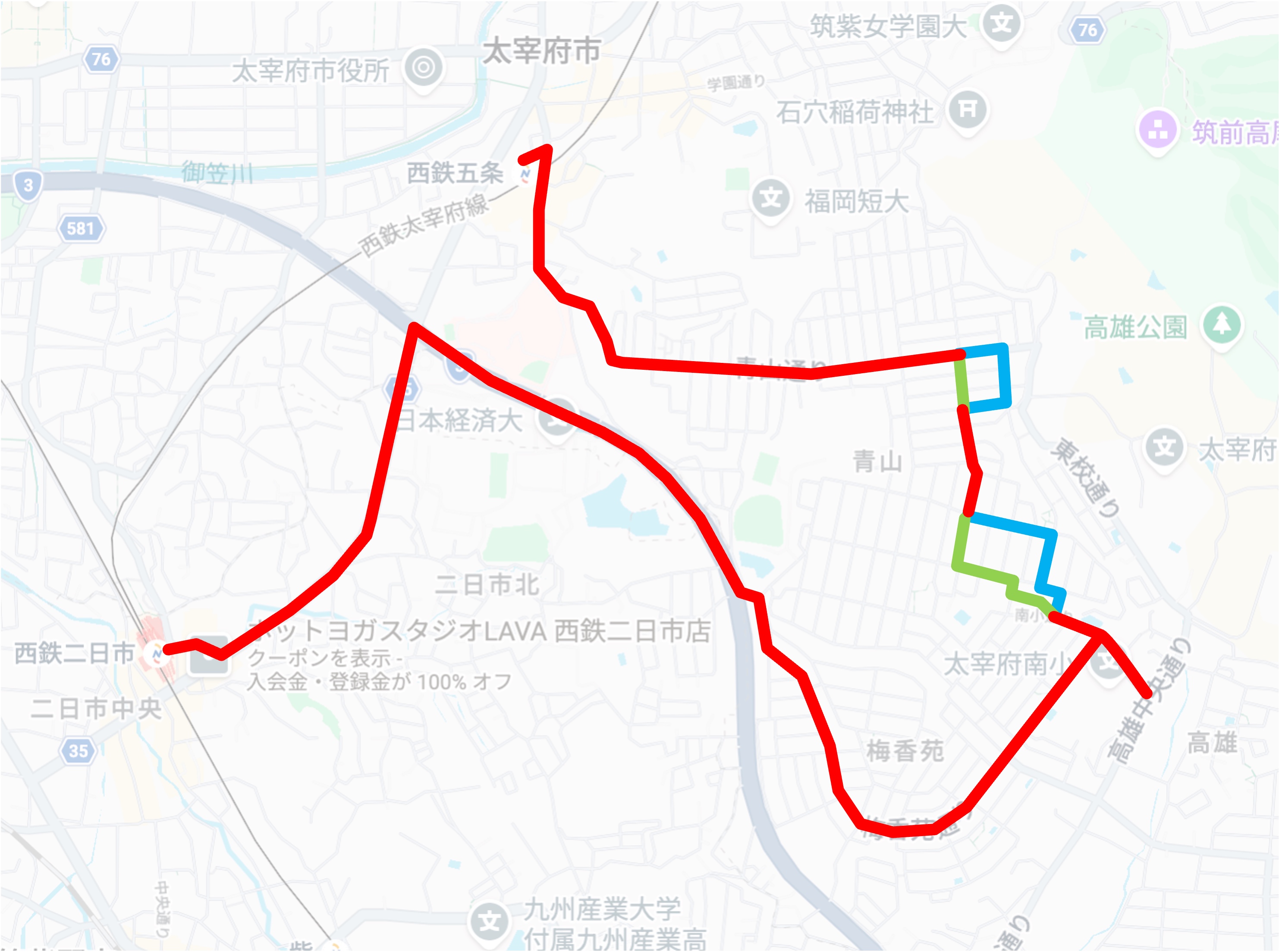 西鉄五条駅方面が緑線で、西鉄二日市駅方面が青線共通部分が赤線です。