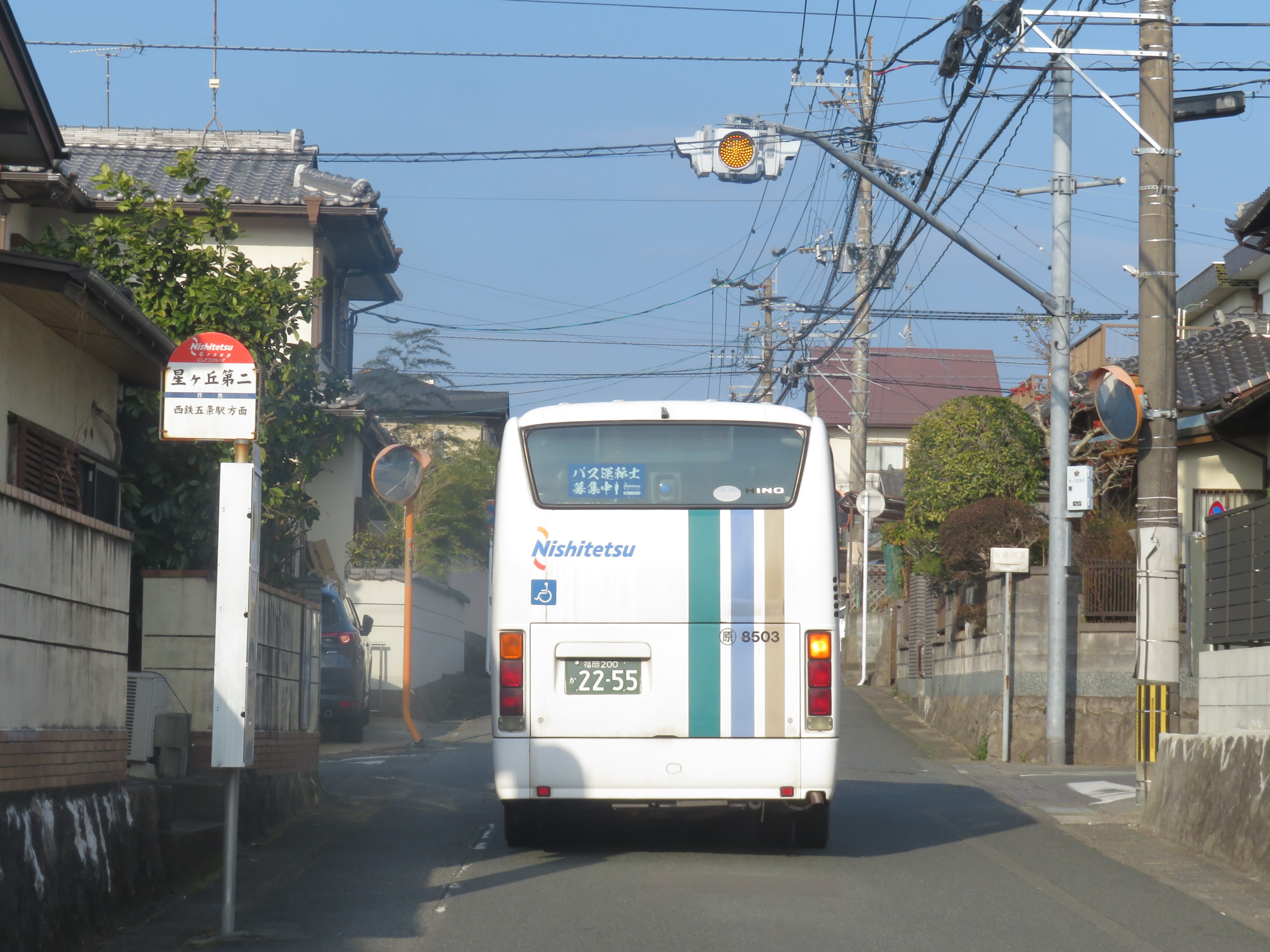 【STEP2】「西鉄五条駅」バス停から太宰府高校入口ゆきに乗車し、「星ヶ丘第二」バス停で下車。約8分、210円。