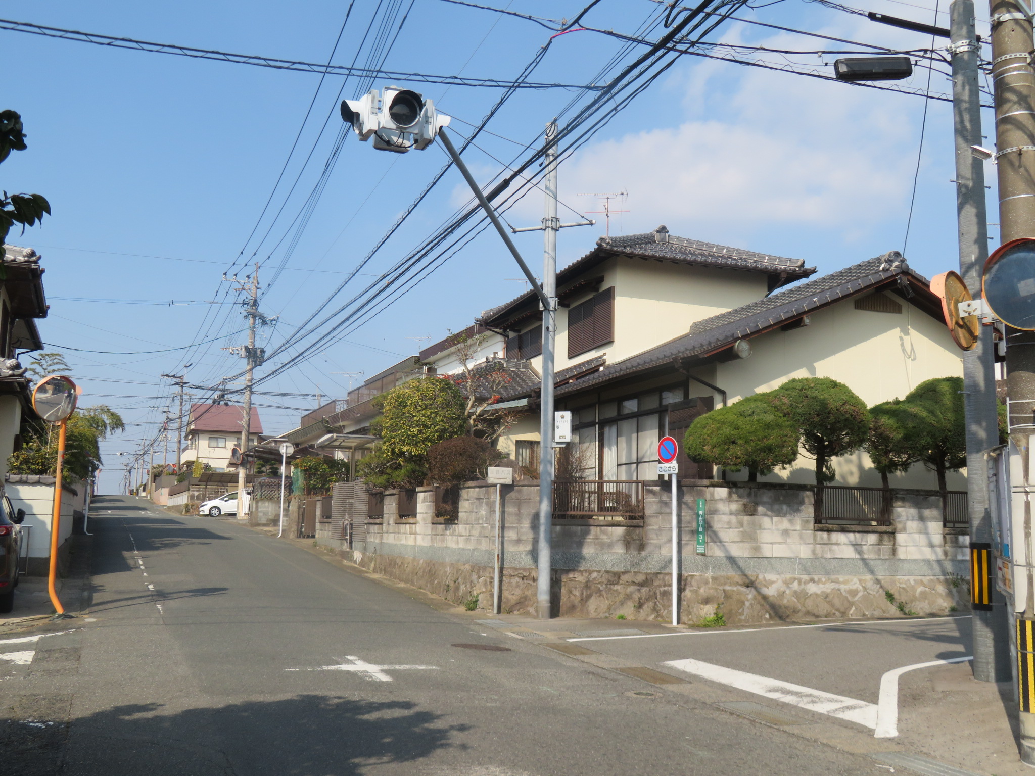 整然とした区画の住宅地では、似たような交差点の景色が連続するため、右左折の場所を間違えないように、誘導看板が設けられているのです。この路線の名物です。
