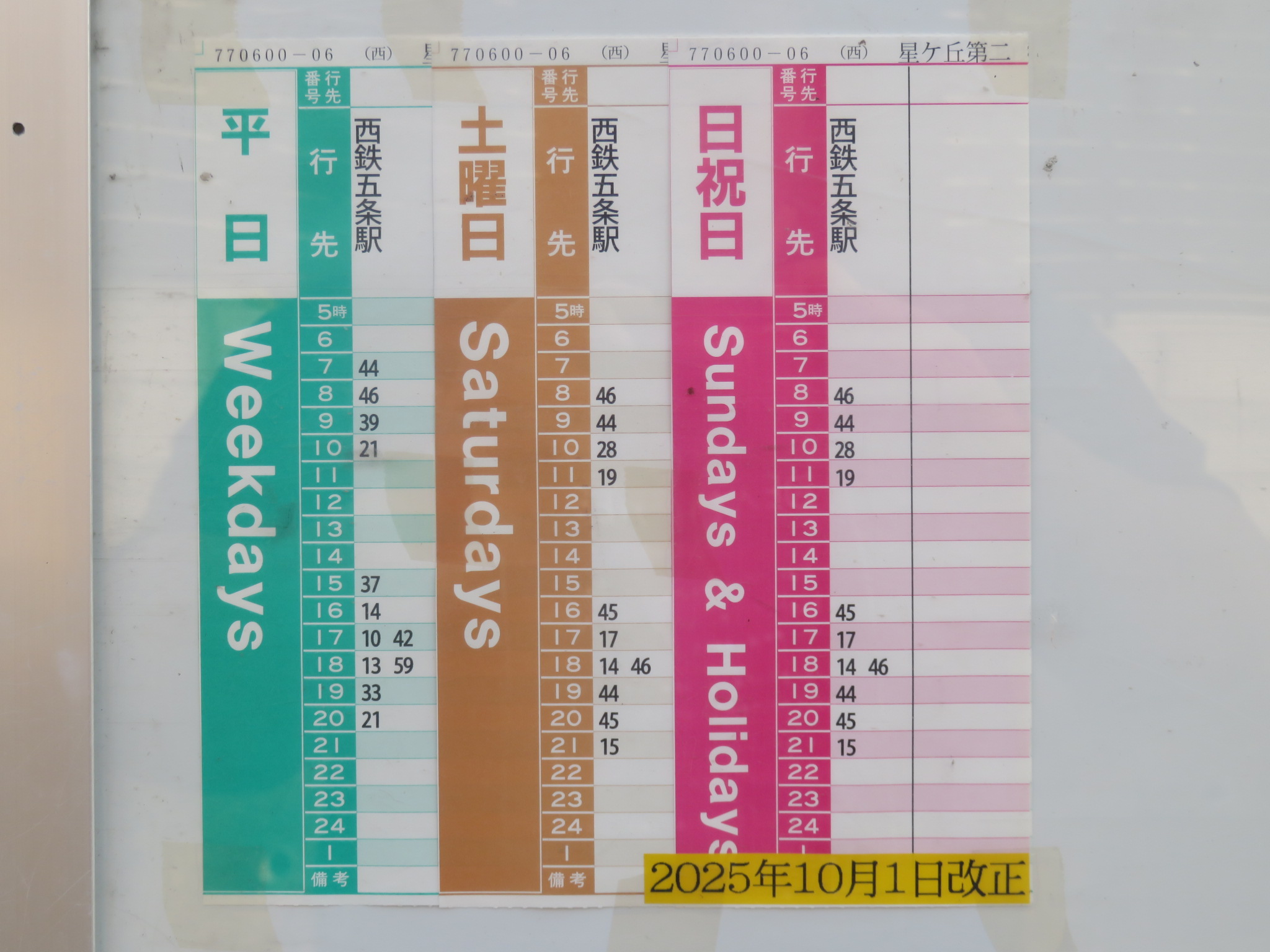 反対方向のバス停が見当たりません。時刻表は西鉄五条駅方面だけしか掲載されていませんので、別の場所にあるはずなのですが、