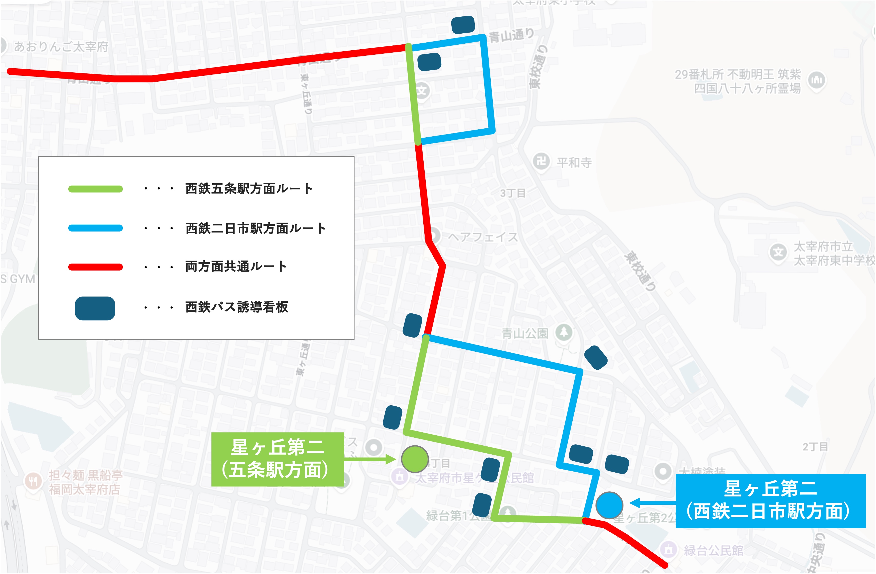 ちなみに紺色の角丸は、西鉄バス誘導看板の位置です。ほかの路線では見られない設備なので、こちらをひととおり訪ねて回るのもよいかと思います。