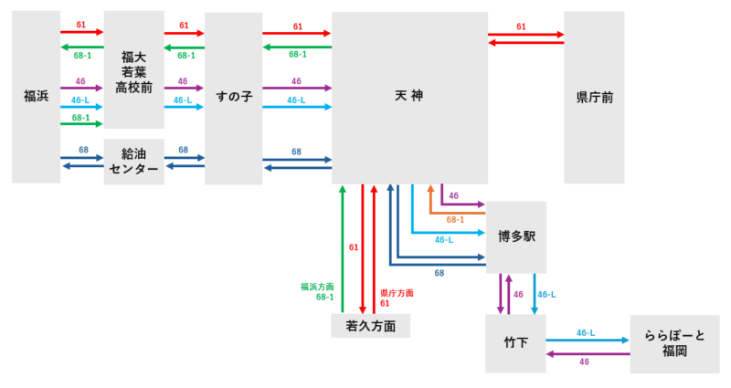・天神あたりで若久方面に行きたければ「61」に乗ればよく、「61」は福浜以外に、県庁のほうからも来るので、合流する天神付近では同じ番号を名乗っているのが望ましい。