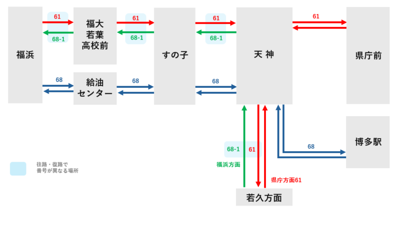 「68」は、博多駅ゆきも、福浜ゆきも、両方向とも同じ番号、しかし若久界隈を経由するバスは、福浜方向なら「68‐1」、福浜を始発として若久方向に向かう便は「61」と、往復で違う番号になっていました。