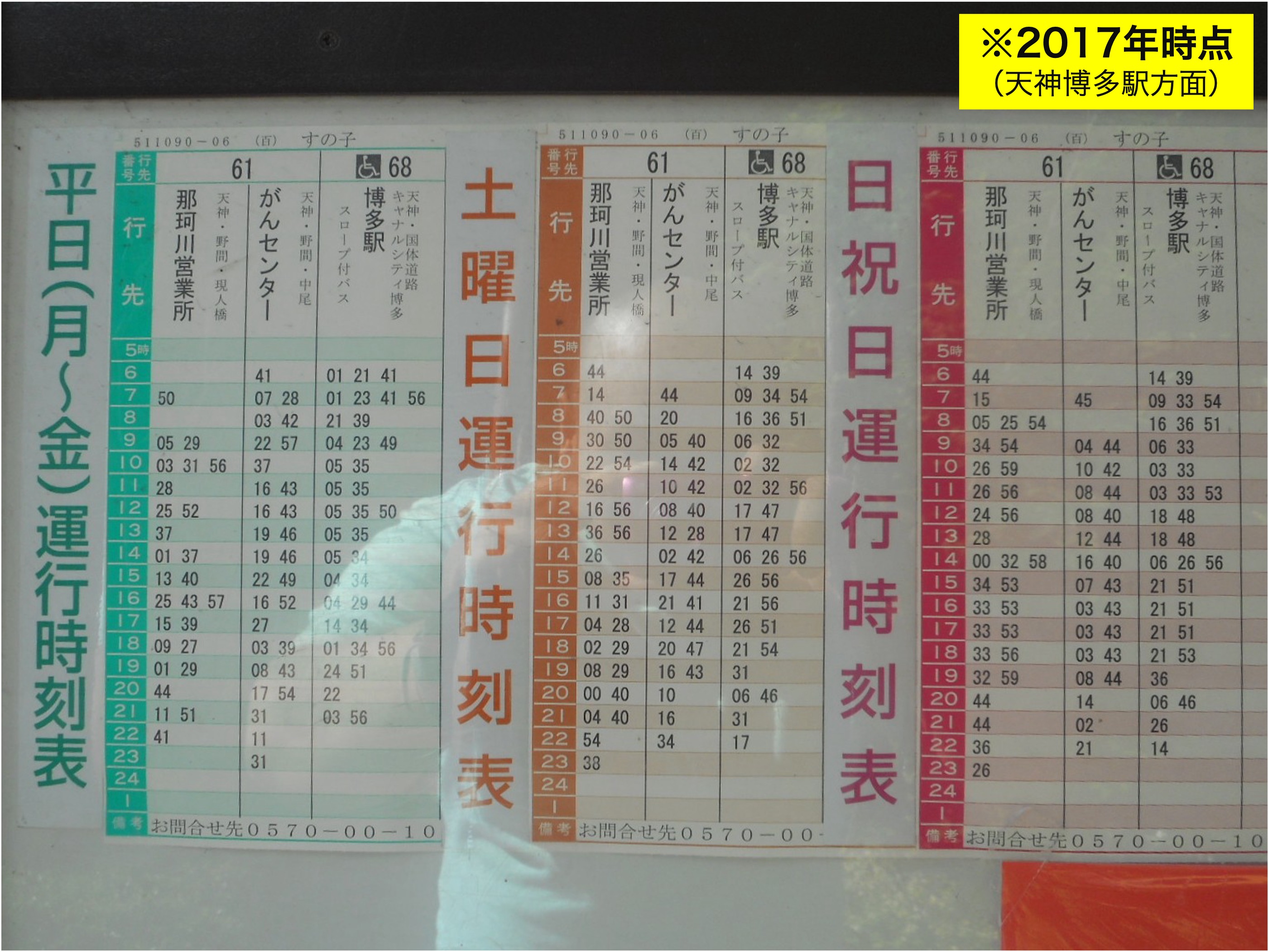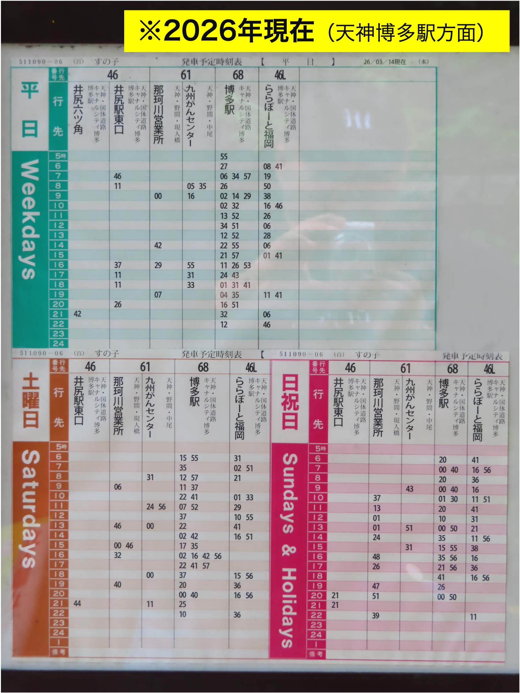 そして反対方向、天神博多駅方面の時刻表、これは敢えて、現在のものを先に載せます。