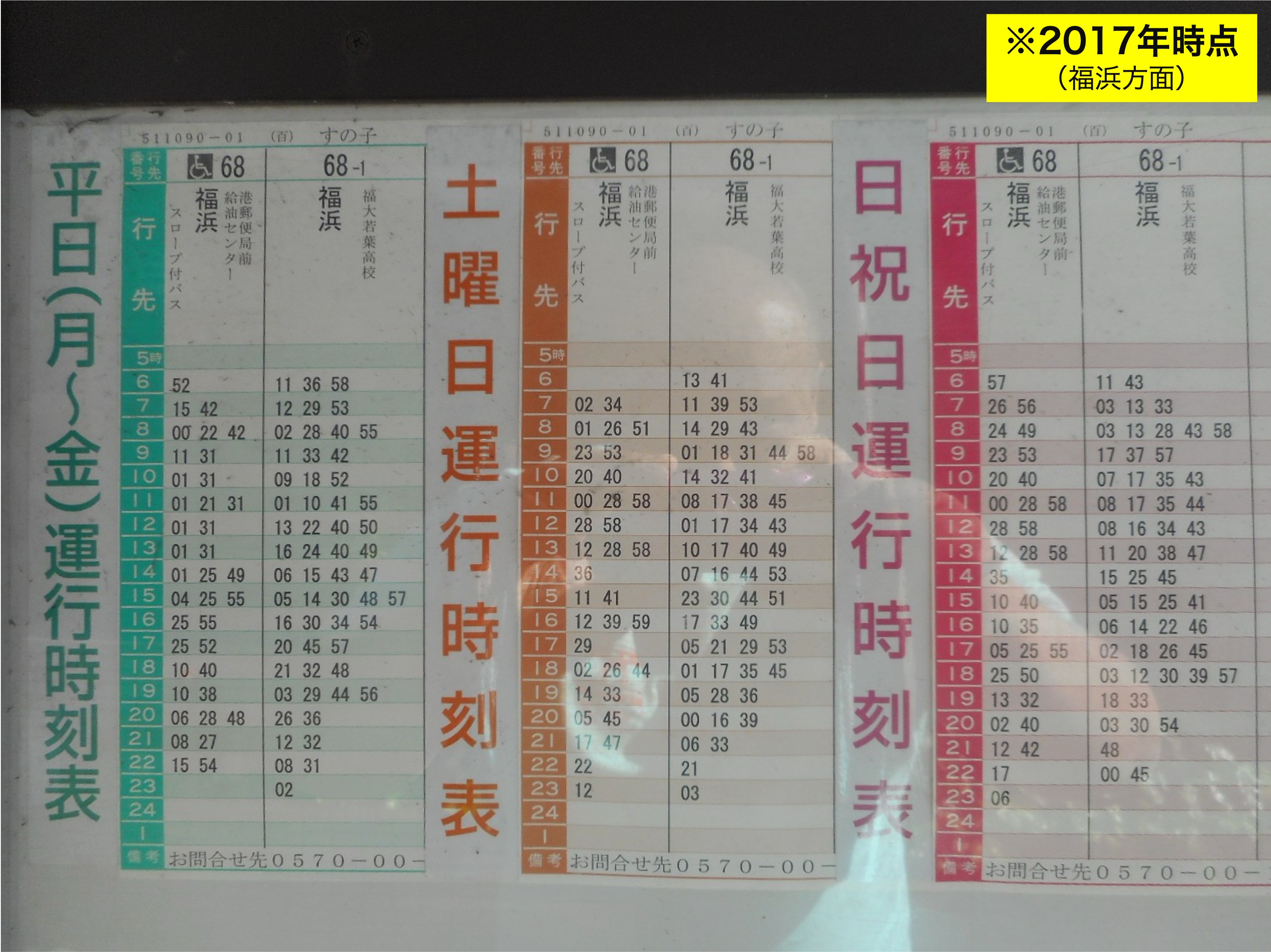 終点はどちらも福浜ですが、途中経路が違って、給油センター経由が「68」、福大若葉経由が「68‐1」です。明快ですね。