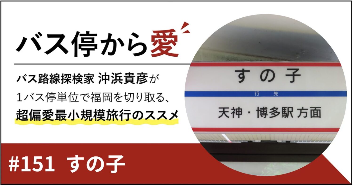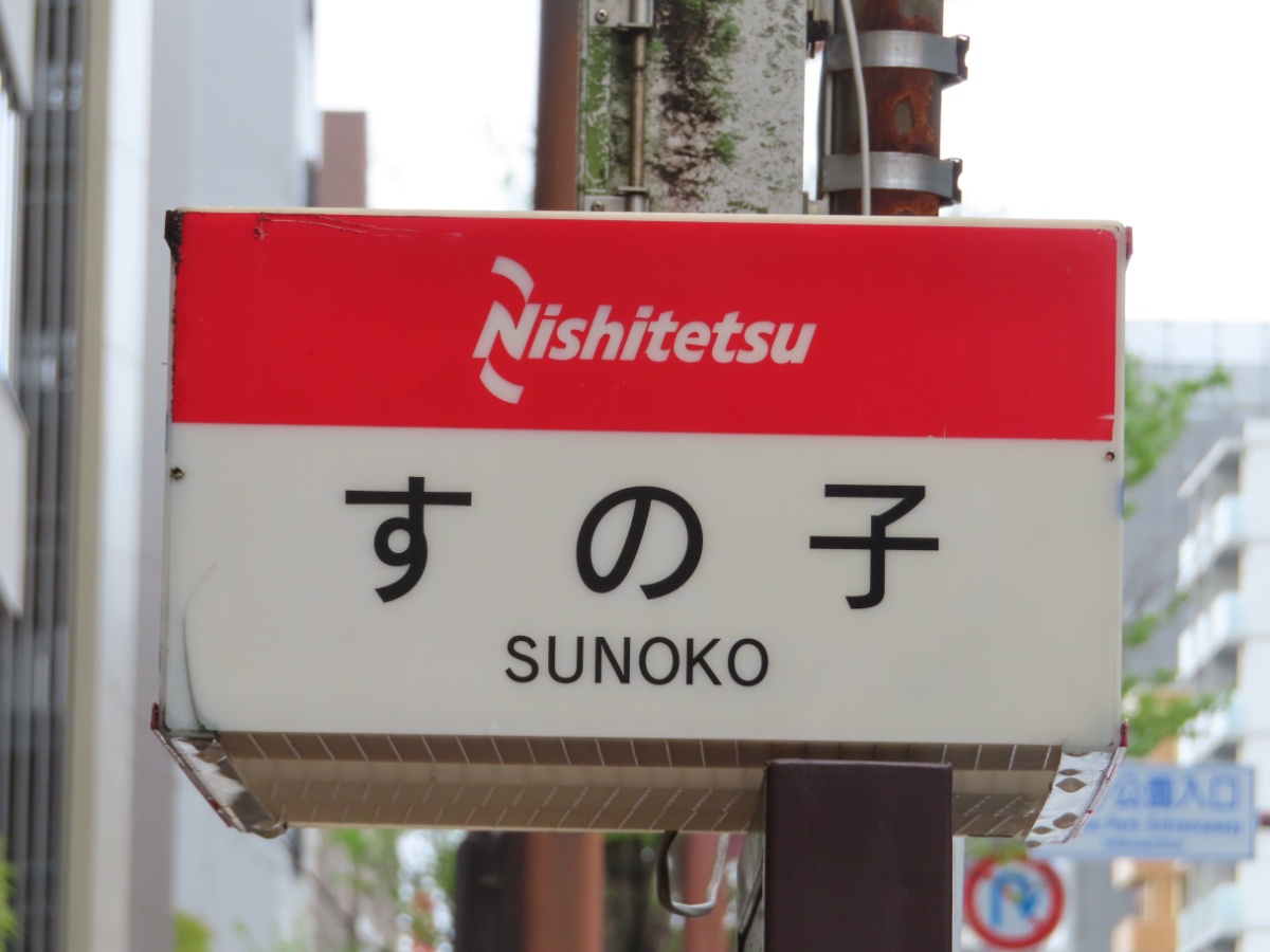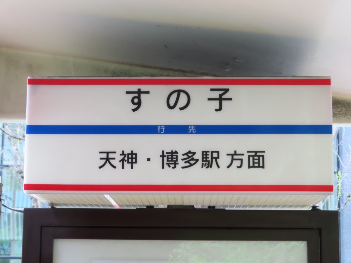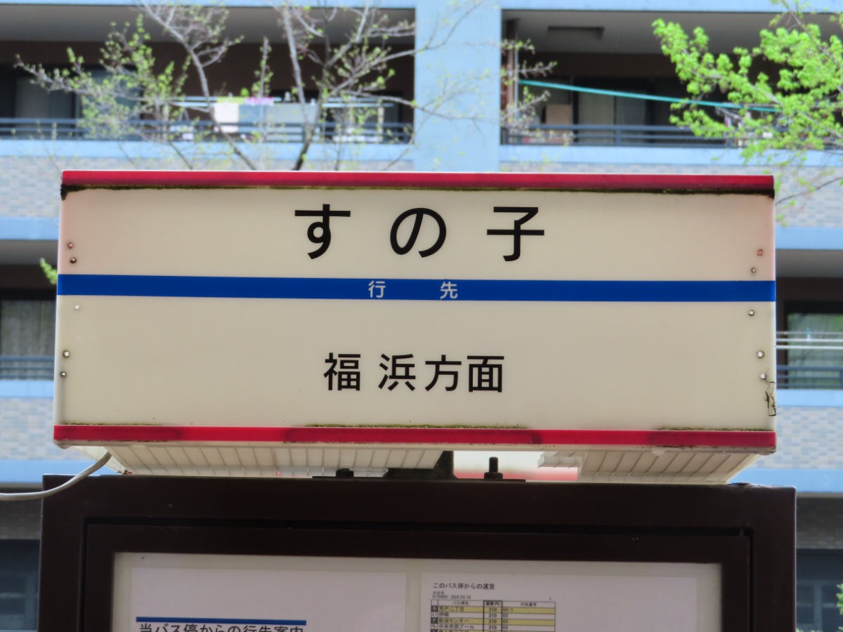 「天神北(3:フタタ前)(那の津方面)」バス停から 68-1福浜行きに乗車し、「すの子」バス停で下車。約8分、210円。