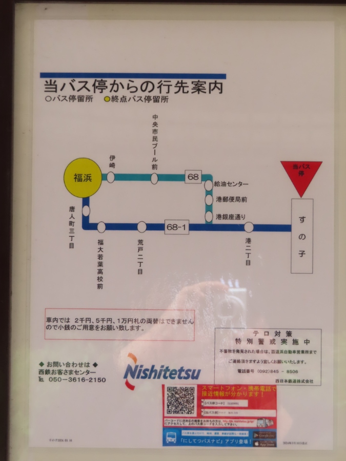 ・天神あたりで福浜に行きたければ、「68」か「68‐1」という、68がついている番号に乗ればいい。天神よりだいぶ手前の若久あたりでは以前、県庁方面も福浜方面も同じ「61」だったので、福浜ゆきを「68‐1」に変更することで、番号での識別が可能になった