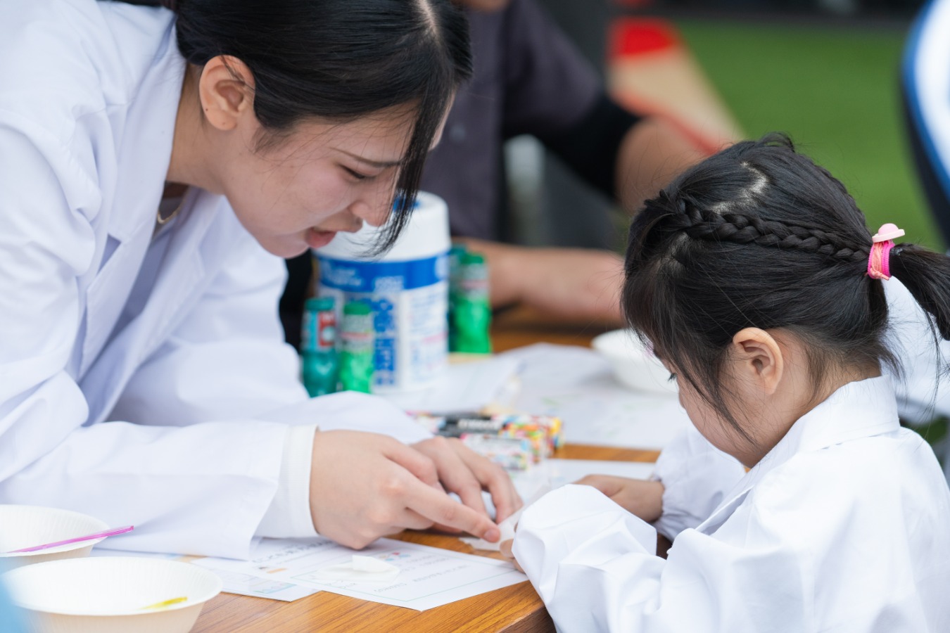 「南区薬剤師会」による「こども薬剤師体験」では、子どもたちが白衣を着てお薬に見立てたお菓子を折り紙の袋に詰めていました