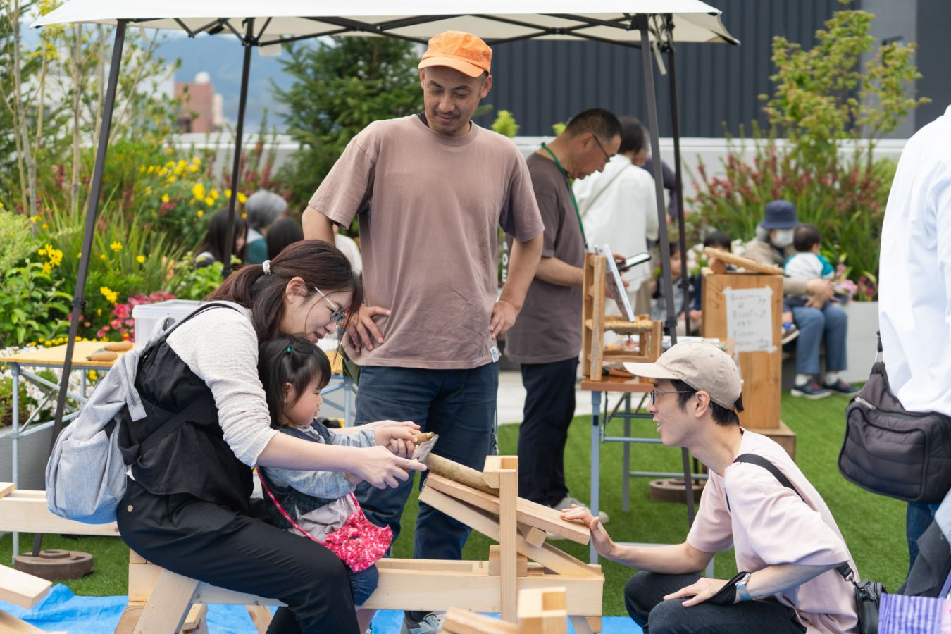 芝生エリアではお子さんが参加できるワークショップが充実し、多くの親子連れでにぎわっていました。